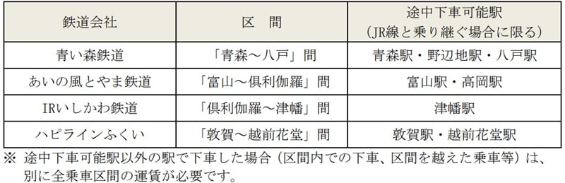 いずれも、JR線から私鉄を経由して当日中にJR線へ乗り継ぐ場合のみ利用可能で、途中下車可能駅以外で下車した場合、全乗車区間の運賃が必要となりますのでご注意ください。