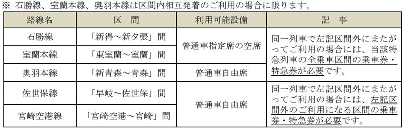 また、特急列車しか走っていない区間など一部路線では特例として、特急列車の普通車指定席の空席や普通車自由席の利用が可能です。