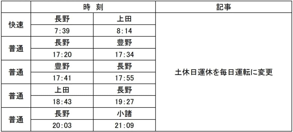 夕方の通勤時間帯には、戸倉 17:54発⇒長野 18:20着の普通列車(平日のみ)が増発されます。また、上田 16:32発の普通列車は長野行き(17:17着)となり、上田〜戸倉間で運転区間が延長されます。土休日のお出かけも便利になります。これまで土休日は運休していた一部の列車が毎日運転に変更されるほか、利用状況を踏まえて一部列車が2両から4両へ増結されます。