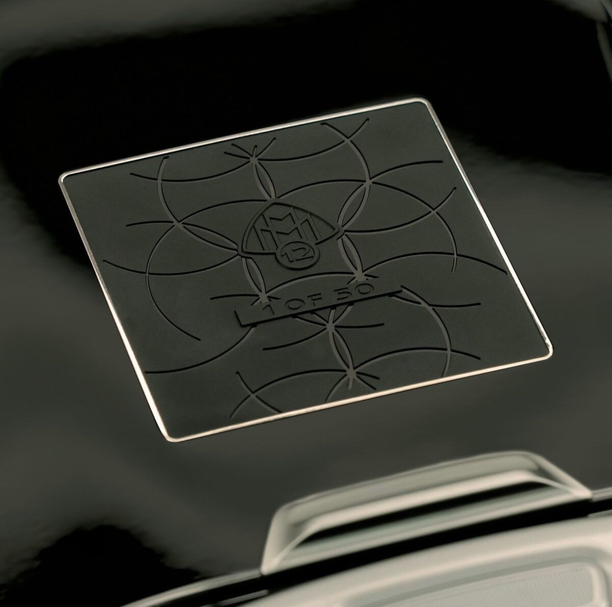Cピラーには、アイコニックな本モデル専用のエンブレムを装備しています。マイバッハ・エンブレムに加え、V12 エンジンのシリンダー配置に着想を得た V 字型パターンの彫刻を24金で仕上げたインレイと、24金製メダルリングで構成された本モデル限定ロゴバッジを装着しました。さらに、伝説の「マイバッハ・ツェッペリン DS 8」のフードオーナメントに着想を得た「12」をあしらったクロームとゴールドのメダルを組み合わせ、特別な存在感を演出しています。