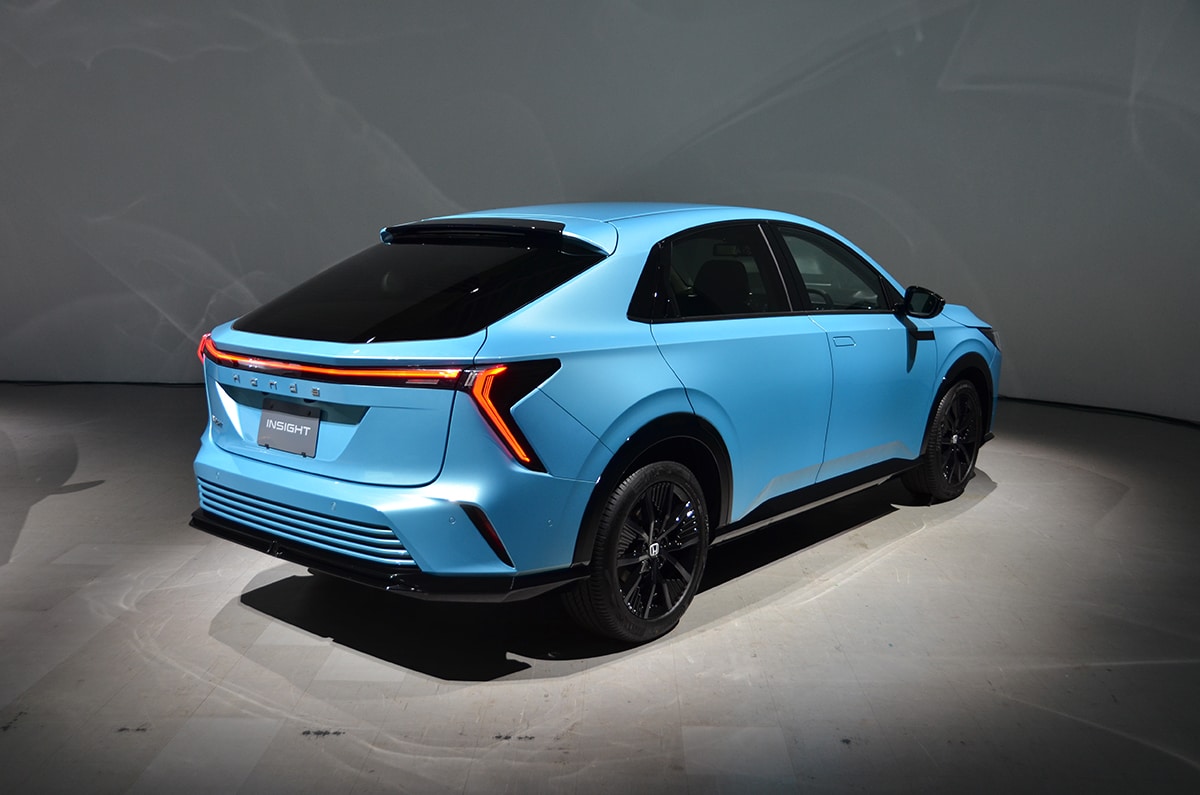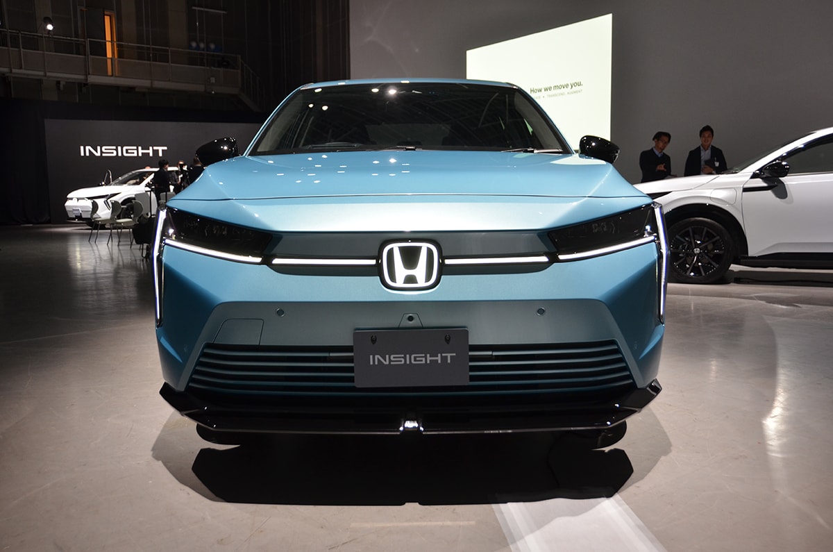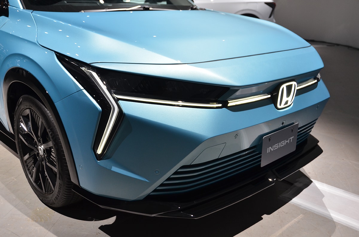投入されるインサイトは「存在感際立つ個性的なEV」としており、エクステリアは、シャープな塊を前方に押しだすような突進感を与えた未来の乗り物を表現。シャープな造形とアイコニックな灯体表現と立体造形によって未来感を表現しているという。