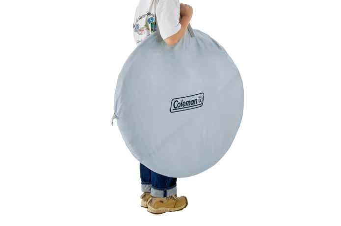それでいて収納サイズは、直径約90cm×厚さ約4.5cm。重量は約3.3kgと、肩掛けストラップ付きで無理なく持ち運べます。