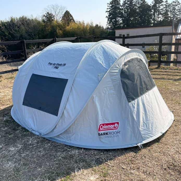 ポップアップテントといえば……のコールマンからは、この春夏に新作が登場! 日光を遮るおなじみの機能ダークルームテクノロジーを採用した「ポップアップシェード DR」です。