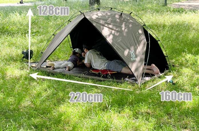 内側にはUPF50+のUVカットコーティングが施され、遮光性は99.9%以上とかなりのハイスペック。展開サイズは約幅220×奥行160×高さ128cmと、大人なら3~4人、ファミリーなら4~5人で過ごせるサイズです。