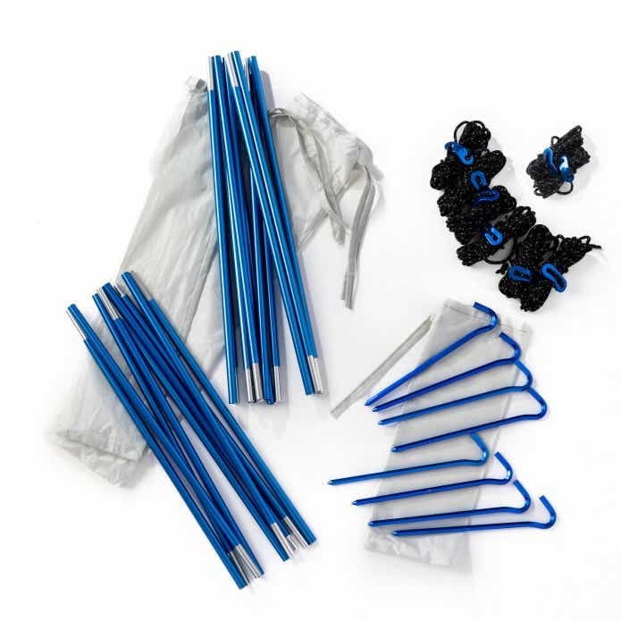 付属のポール・ガイライン・ペグは、こちら。失くしにくい鮮やかなブルーカラーが、クレイジークリークらしく遊び心がありますね。