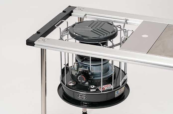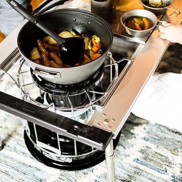 パッと見はストーブのようですが、実は長時間の煮込み調理に適した「コンロ」なんです。天板とテーブル面がフラットに並ぶので、重い鍋の移動も楽ちん。