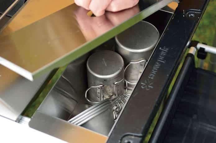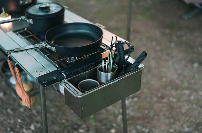 さすがはスノーピークという緻密な作りのステンレスの蓋付きボックスで、ちょうどハーフユニット分のサイズが、カトラリーやレードル、シェラカップなどの食器入れにピッタリ。
