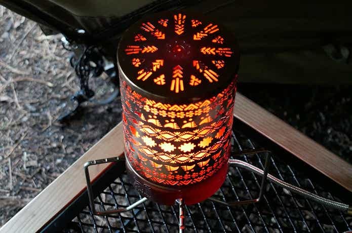 内側にはステンレスメッシュパーツを備えた二重構造で熱効率が高く、遠赤外線効果で周囲に熱を拡散。赤く浮かび上がったナバホ柄の美しさに、心も癒やされます。