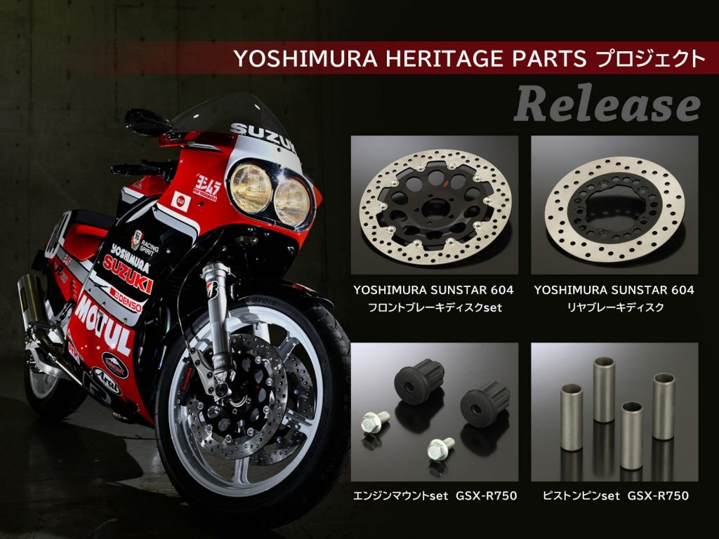 同シリーズでは、1986年AMAスーパーバイク参戦車両をオマージュした「YOSHIMURA SUNSTAR 604」フロント/リヤブレーキディスクをはじめ、純正互換のエンジンマウントセットやピストンピンセットを展開する。いずれも当時のデザインを再現し、1985~1992年式のGSX-R750/1100に対応するモデルとなる。