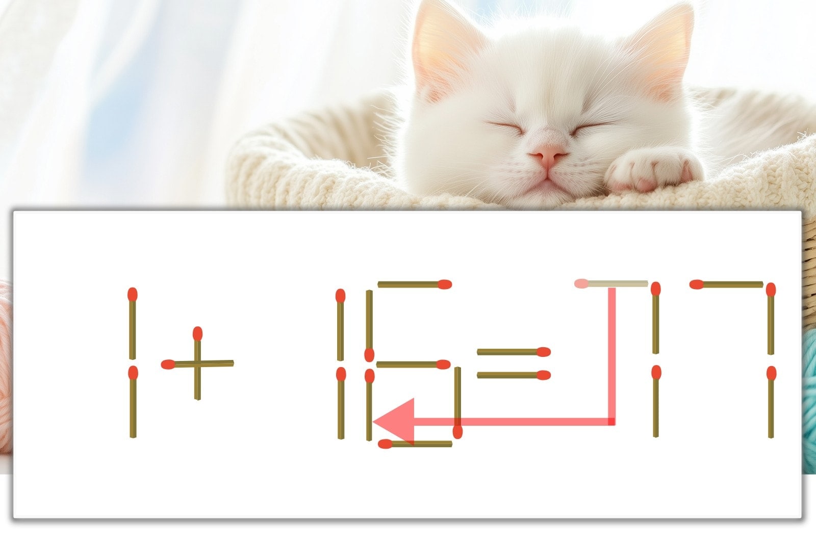 「7」を別の数字に変化させると答えが導き出せます。十の位の「7」のマッチ棒を1本移動して、「5」を「6」にしてみましょう。すると、「1+16=17」が成立します。