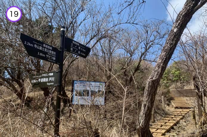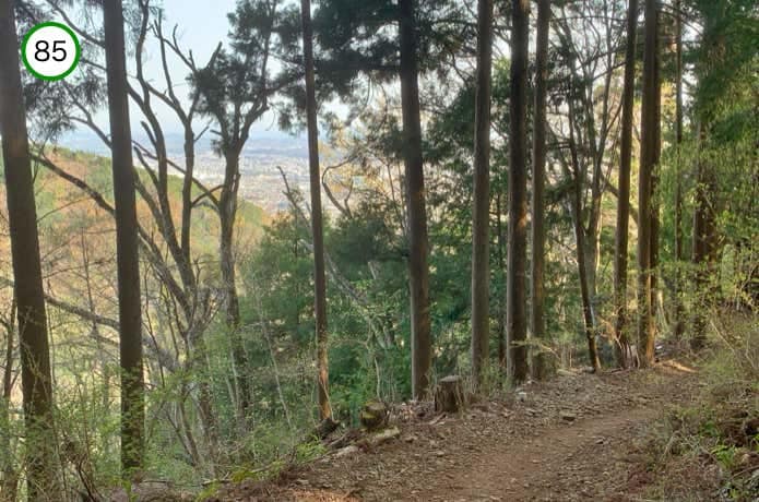 左手へ下ると稜線の東面をトラバース(横断)するように登山道が延びています。樹間からは秦野の街並を見下ろすことが可能。