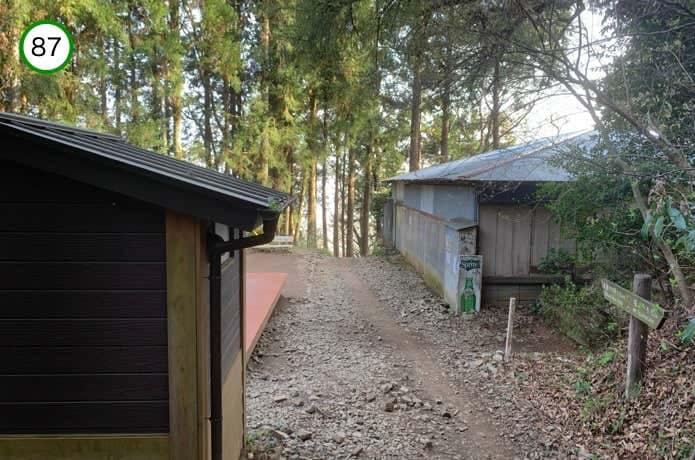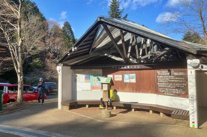左手にトイレが見えてきました。ここで県道70号線と分かれ、左奥の林道へと進んでいきます。ヤビツ峠から1.6km、タクシーを利用すればここまで乗車することもできます。