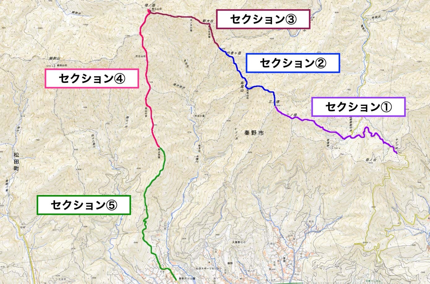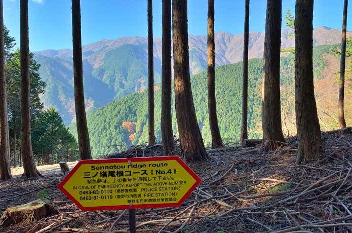 セクション①のゴールである三ノ塔からは、距離が長いものの歩きやすい樹林帯を下る三ノ塔尾根コースで大倉へと下山可能。