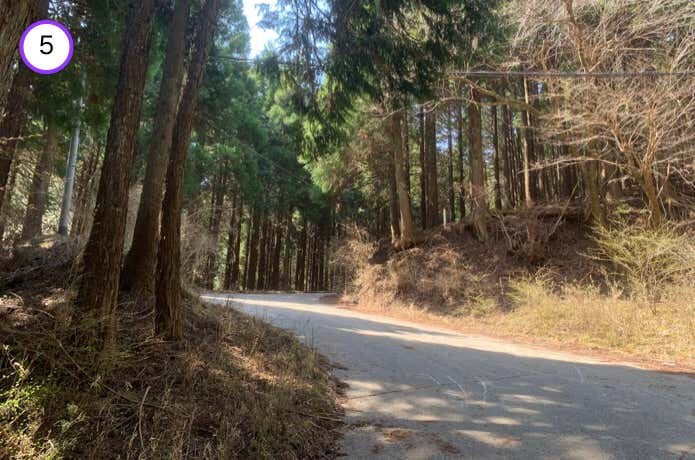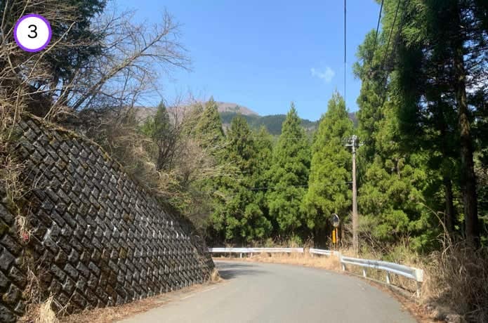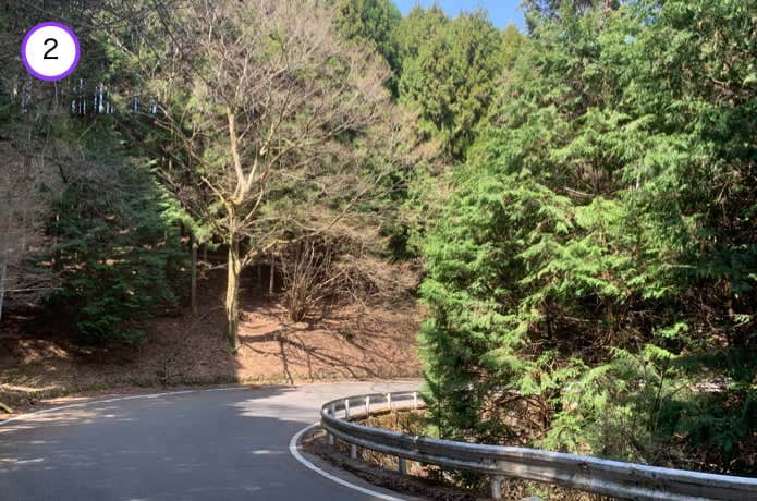 綺麗にアスファルト舗装された県道70号線は、下り坂で歩きやすい道です。ただしクルマの往来があるので注意しましょう。
