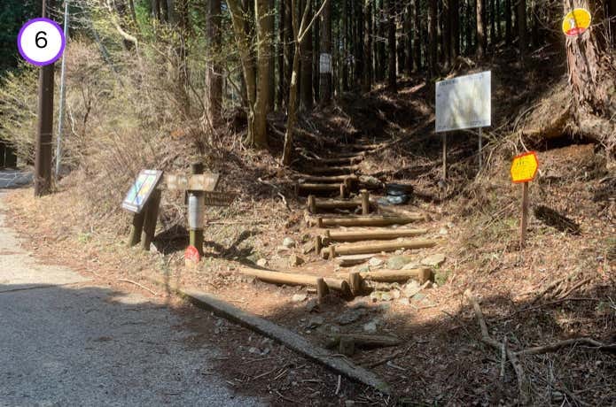 やがて林道の右側に登山口があり、木製階段が針葉樹林帯の中へと延びています。