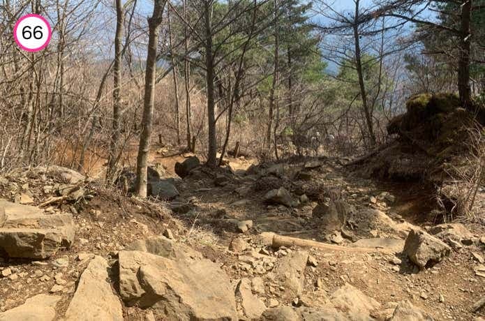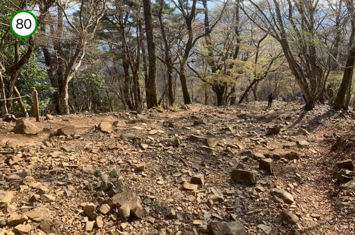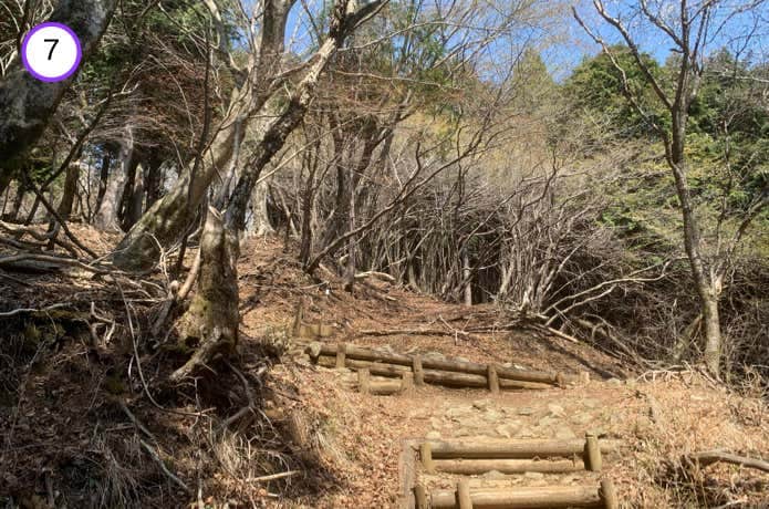 登山道は木製階段やガレ場になっており、樹林帯をやや急に登っていきます。