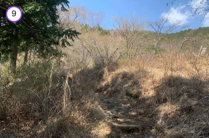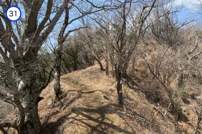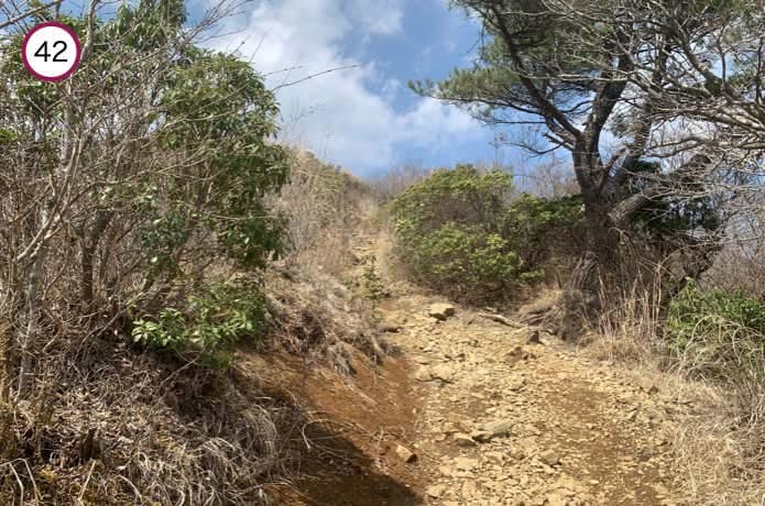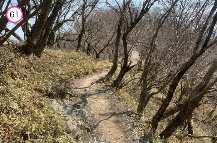 雑事場ノ平で分岐した大観峰や大倉高原テントサイト経由の道と合流。この先も、登山道は稜線の東面をトラバースしながら続いていきます。