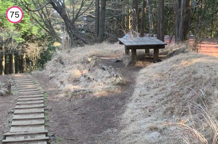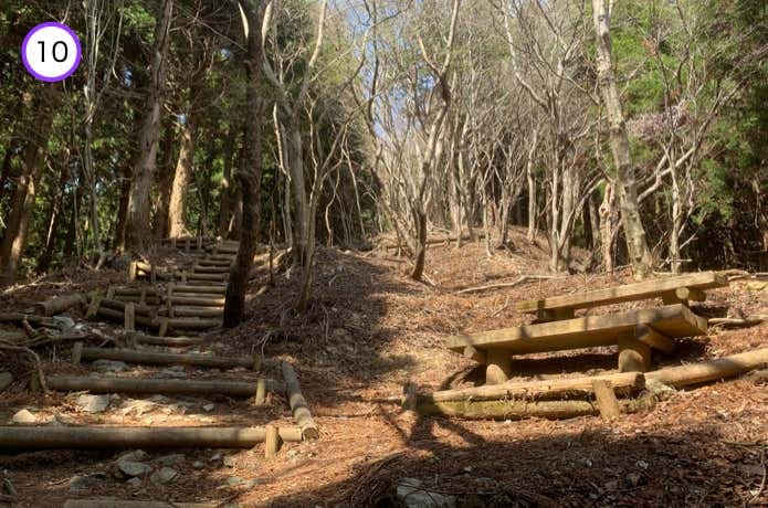階段が終わると、いったん平坦な稜線に。さらに進んだ右側には、ベンチも設置されています。