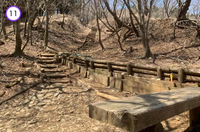 針葉樹林帯を抜けたところにベンチがあり、ひと息つけます。この先の広葉樹林帯にも、階段が続いています。