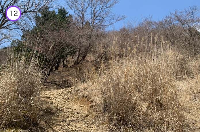 二ノ塔が近づくと登山道はガレ場となり、カヤトなどの草原の斜面を登っていきます。