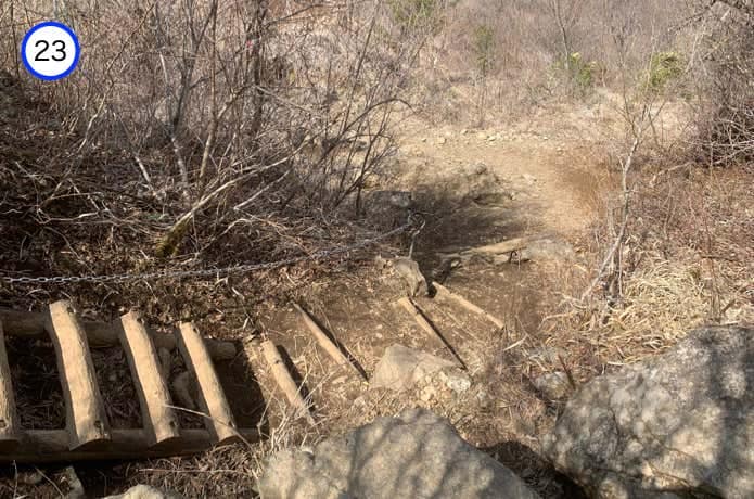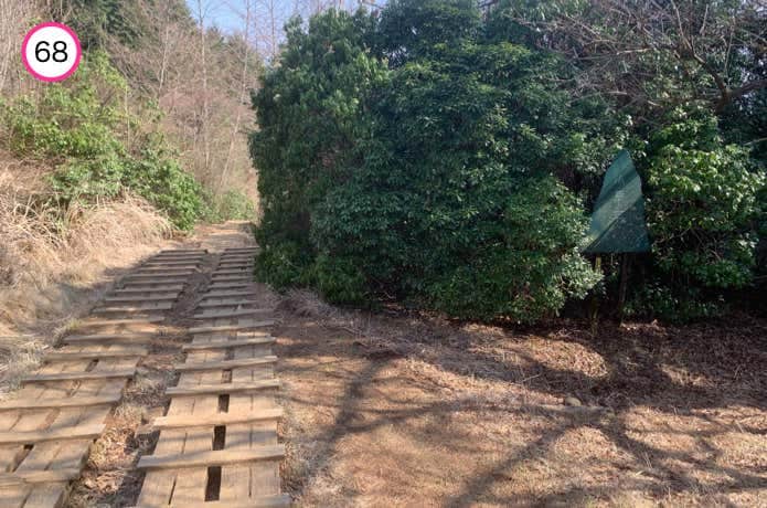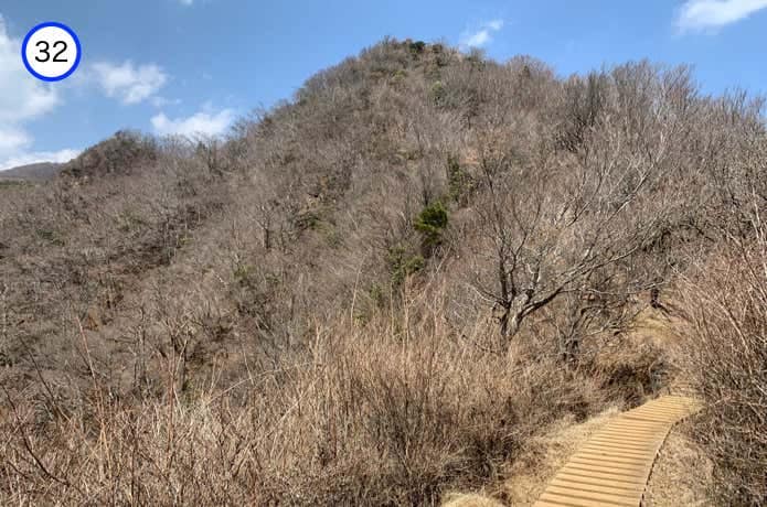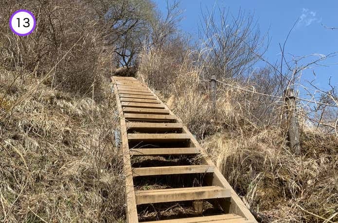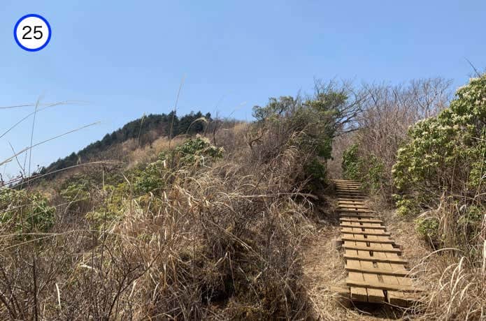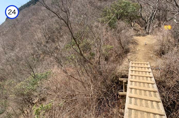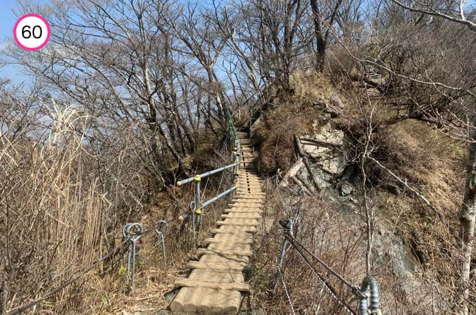 烏尾山との鞍部には、これまた木製の橋がかけられています。ここからやや急な階段を登り返します。