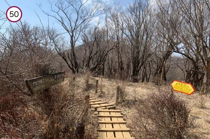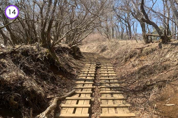 ガレ場が終わると、登山道は平坦な木道へと変化。周囲にはモミジが植樹されており、秋には鮮やかな紅葉のトンネルとなります。