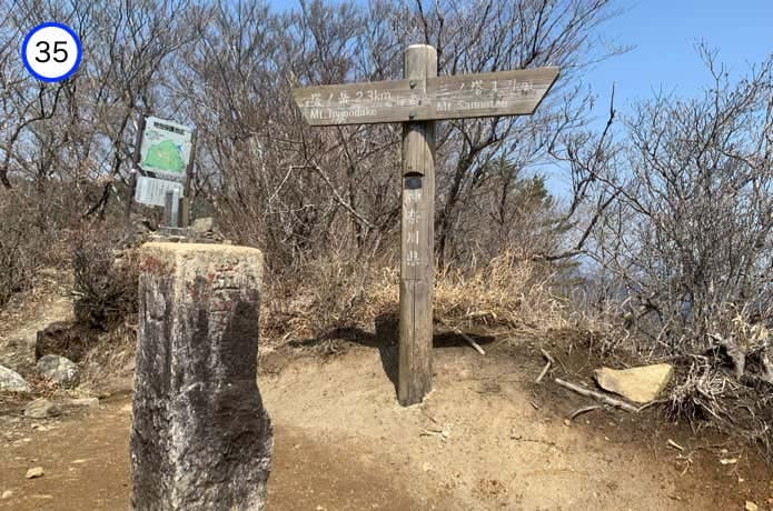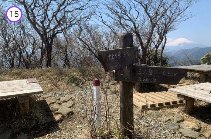 大きなベンチが複数設置された二ノ塔(1140m)の山頂です。西側には次にめざす三ノ塔が堂々とそびえ、富士山も望むことができます。