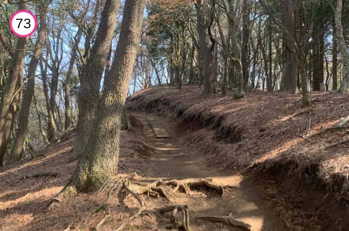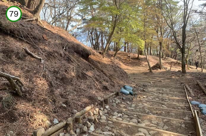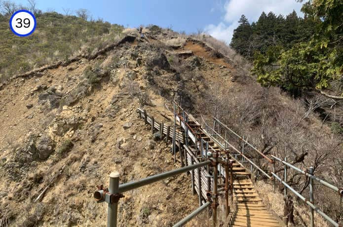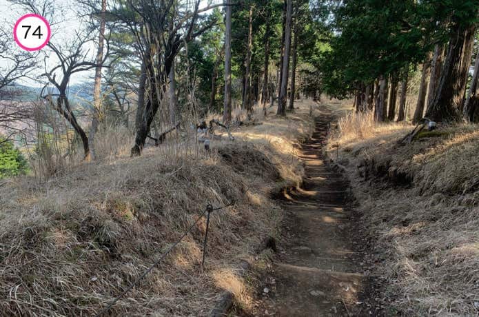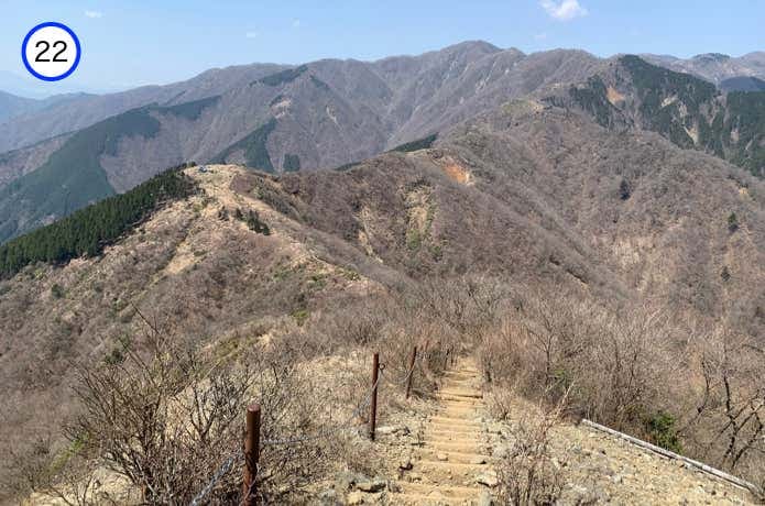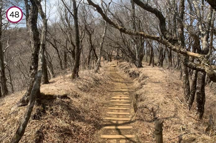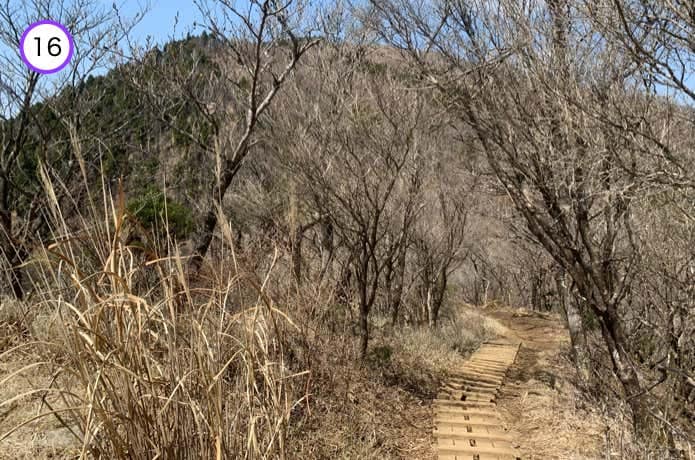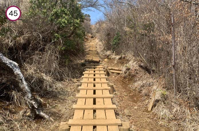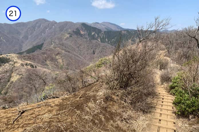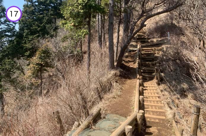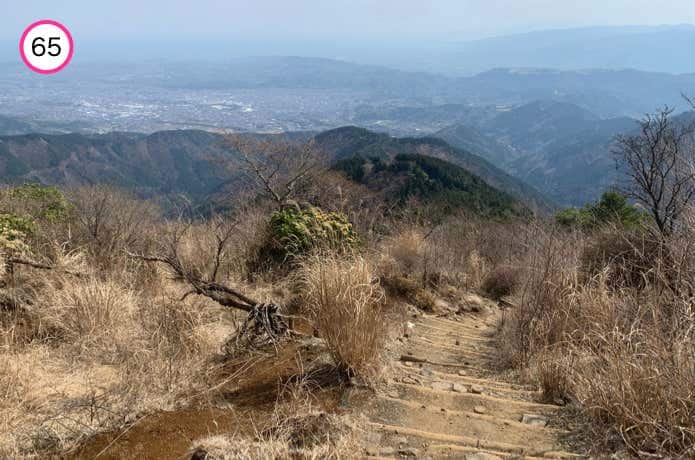 天神尾根分岐からの階段は傾斜がややなだらかで、正面に箱根連山を望むポイントもあります。