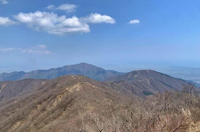 花立ノ頭(1370m)の山頂付近は、平坦な木道となっています。前方には相模灘の青い海と、真鶴半島・伊豆半島・箱根の山々を望むことができます。