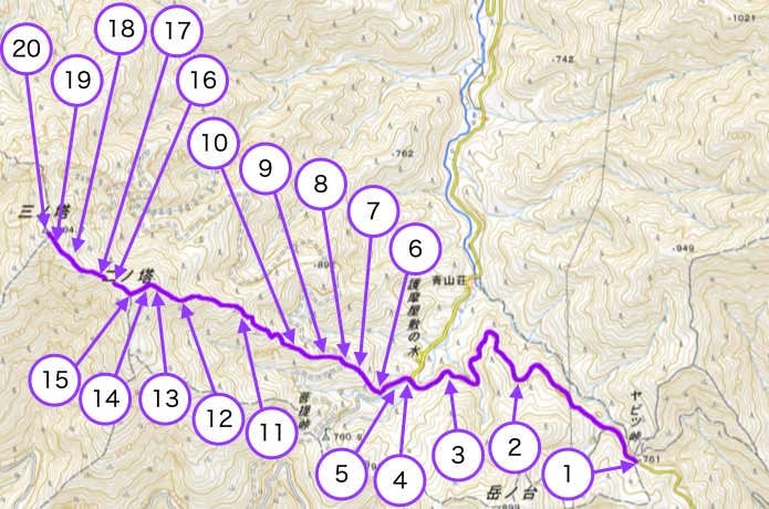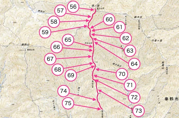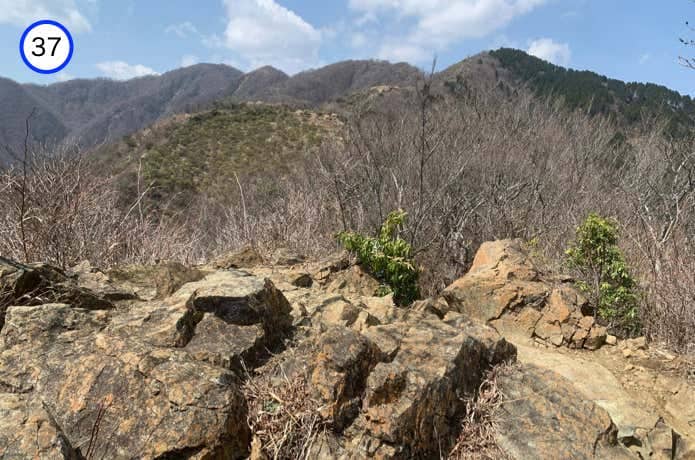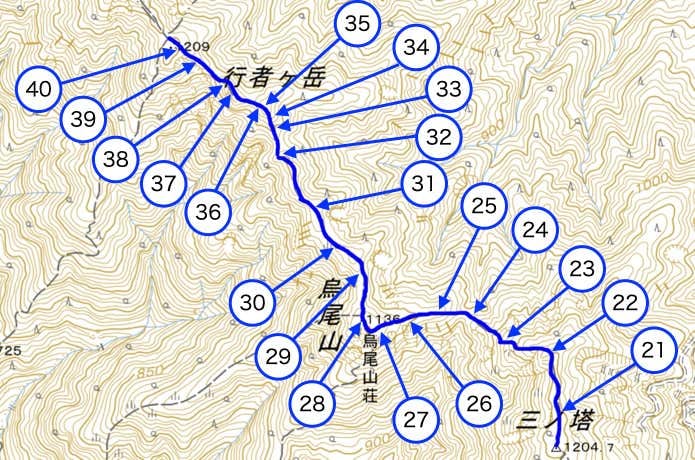 このセクションでは、烏尾山(1136m)・行者ヶ岳(1180m)・政次郎ノ頭(1209m)を越えます。特に行者ヶ岳は岩峰になっており、岩場・鎖場などの難所が点在します。