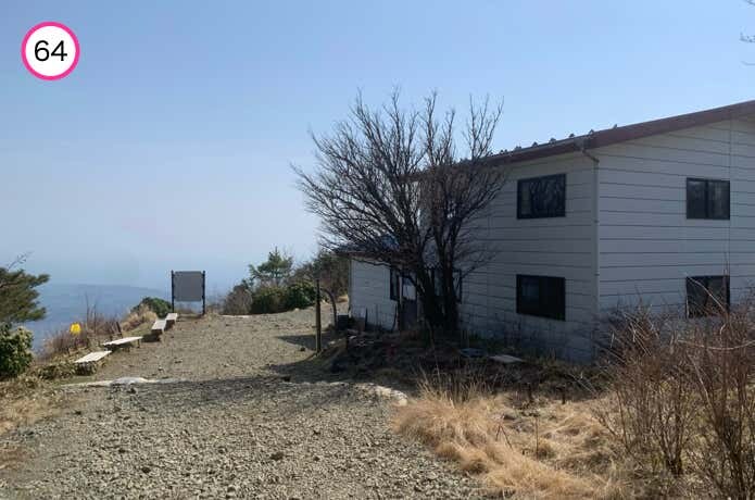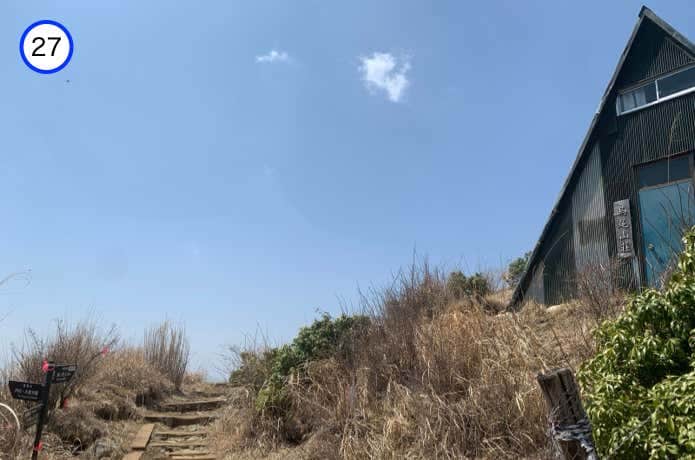 下っていくと右手にバイオトイレがあり、すぐに青い屋根が目印の花立山荘へ到着。ベンチが設置されており、ここから見下ろす相模灘の展望も秀逸です。