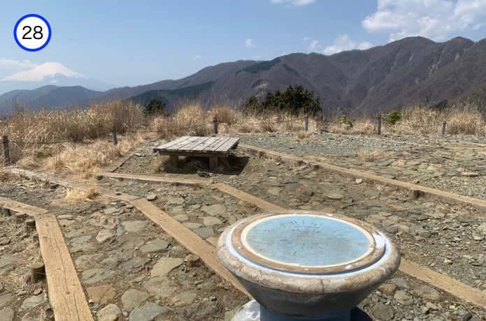 烏尾山荘跡の裏手にはバイオトイレもありますが、山荘の営業終了にともなって閉鎖。次のトイレは木ノ又小屋前となります。烏尾山(1136m)の広い山頂にはベンチや展望案内板が設置されており、塔ノ岳や富士山を眺望することができます。