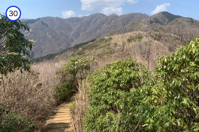 大倉尾根の稜線は木道や階段で整備されており、最初の木製階段が終わるとややなだらかな下りに変わります。