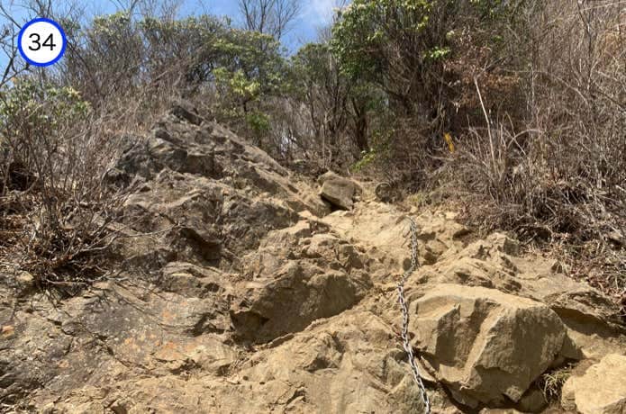 鎖がかけられたハシゴを通過すると、ザレ場の下りとなります。登山道には錆びた古い鎖も設置されていますが、特に頼らなくても問題なく下ることができます。