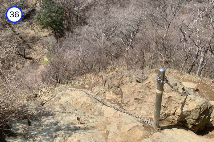この岩峰からの下りが、表尾根でもっとも注意力が必要とされる区間です。登山道の両側に鎖が設置されているので、必要に応じて掴まりながら慎重に下りましょう。