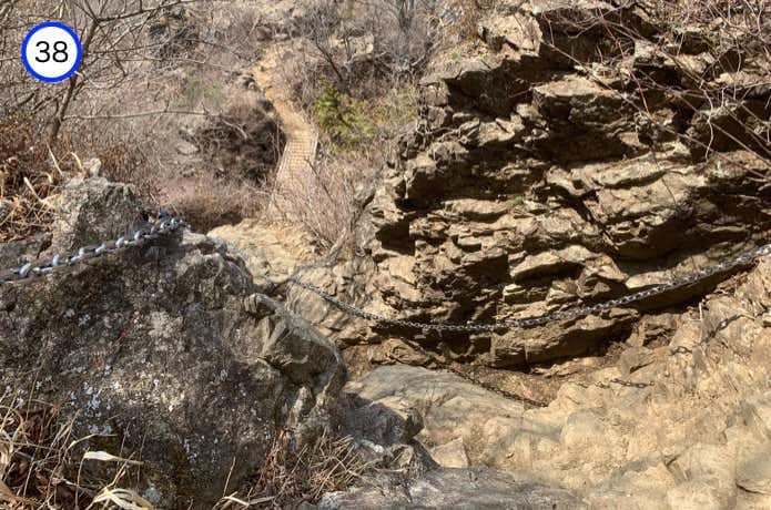 階段が終わると、今度は岩場の斜面を下ります。距離はそれほど長くなく、やがてゆるやかで段差の広い階段の下りへと変わります。