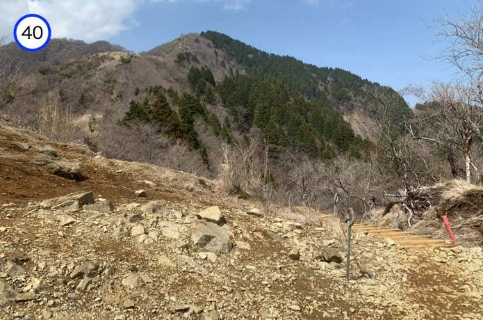 ガレ場が終わり、登山道は歩きやすい木製階段へ変わります。