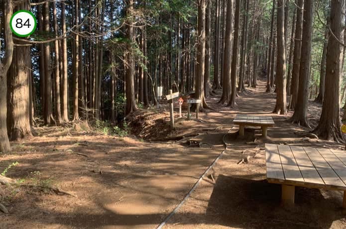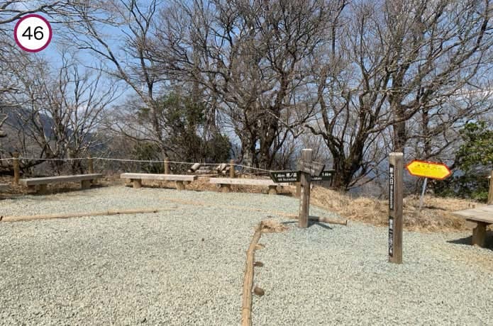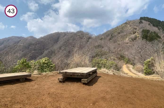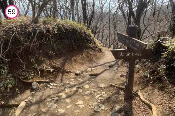 見晴茶屋からほぼ平坦な尾根を進んでいくと、ベンチが設置された雑事場ノ平(ぞうじばのたいら)です。右手の道を直進すると大観峰や大倉高原テントサイトを経由できますが、左手へ進んだ方が近道。どちらを進んでもやがて合流します。