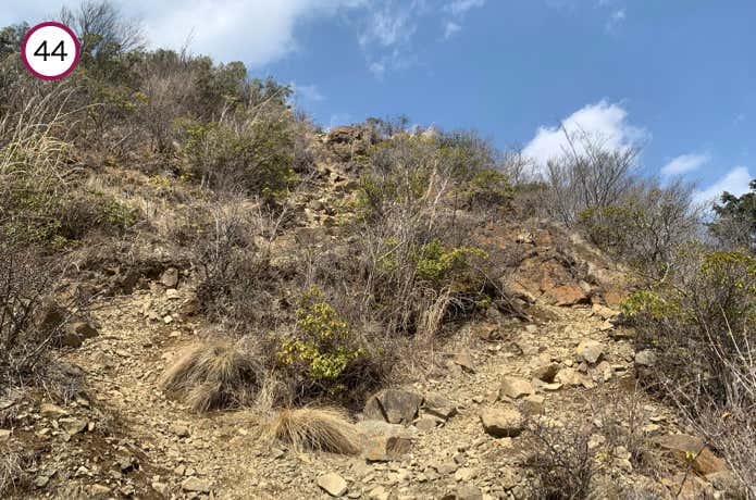 続いて、ガレ場の下りとなります。稜線の両側が崩落している痩せ尾根も通過するので、慎重に通過しましょう。