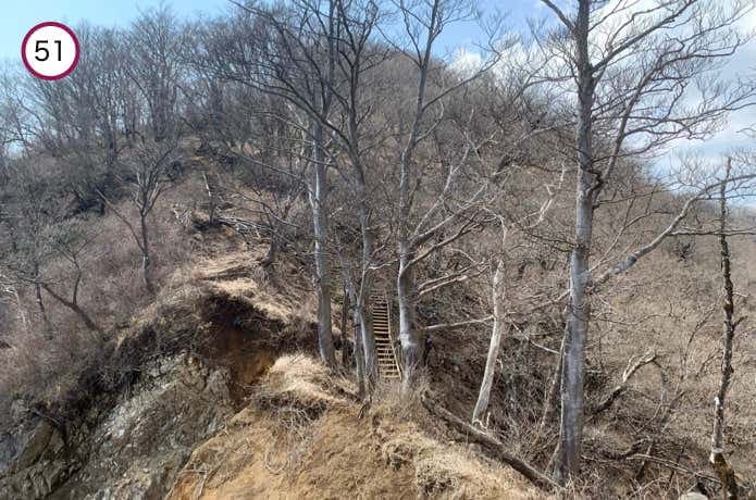 花立ノ頭との鞍部は崩落しており、鉄パイプの手すりがついた橋がかけられています。