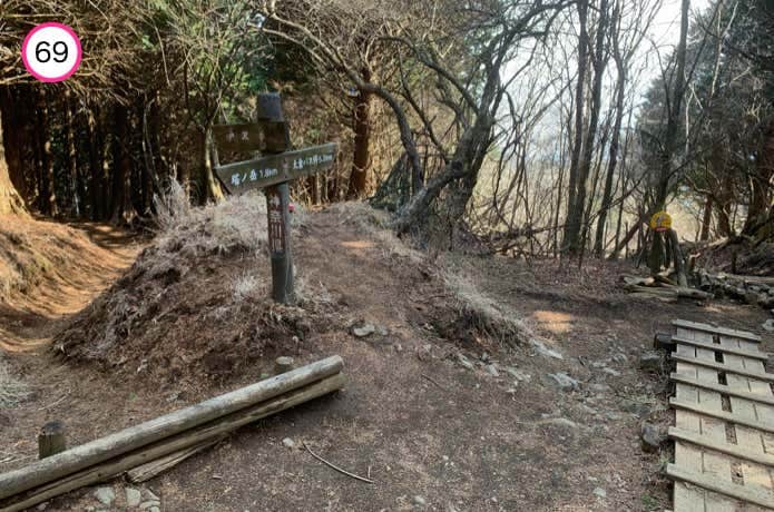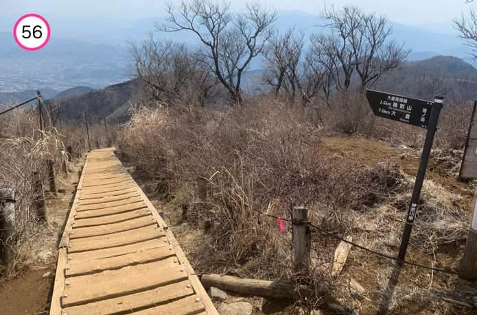 木道がふたたび下りに変わり進んでいくと、鍋割山稜との分岐である金冷しに到着です。大倉尾根は左方向に進みます。