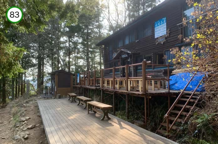 ガレ場が終わると、周囲にベンチ・テーブルが設置された堀山の家です。こちらも宿泊は週末と年末年始のみで事前予約制です。