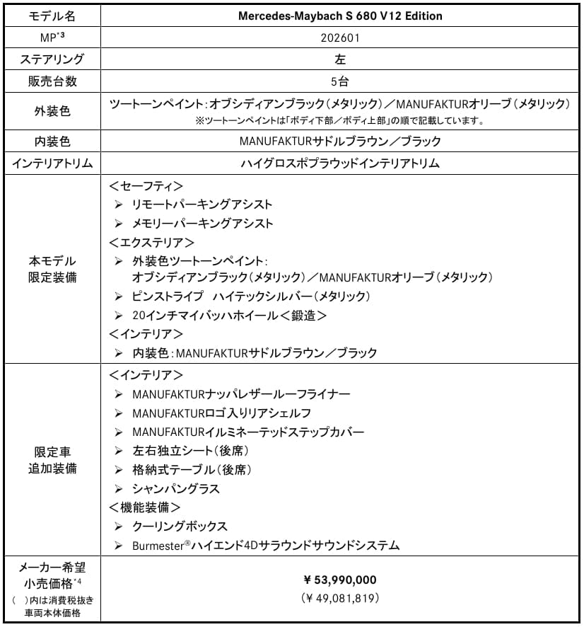 メルセデス・ベンツ日本合同会社は、メルセデス・マイバッハSクラスの特別仕様車「Mercedes-Maybach S 680 V12 Edition」を発表し、全国のメルセデス・ベンツ正規販売店で注文受付を開始した。