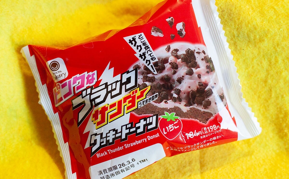 ファミリーマートが実施している「ブラックサンダー」とのコラボの中には、お土産の定番にもなっている「ご当地サンダー」の味わいをイメージしたものがあります。今回ご紹介する「ピンクなブラックサンダー クッキードーナツ(いちご)」(税込198円)もその一つで、北海道ブラックサンダーとのコラボ商品です。