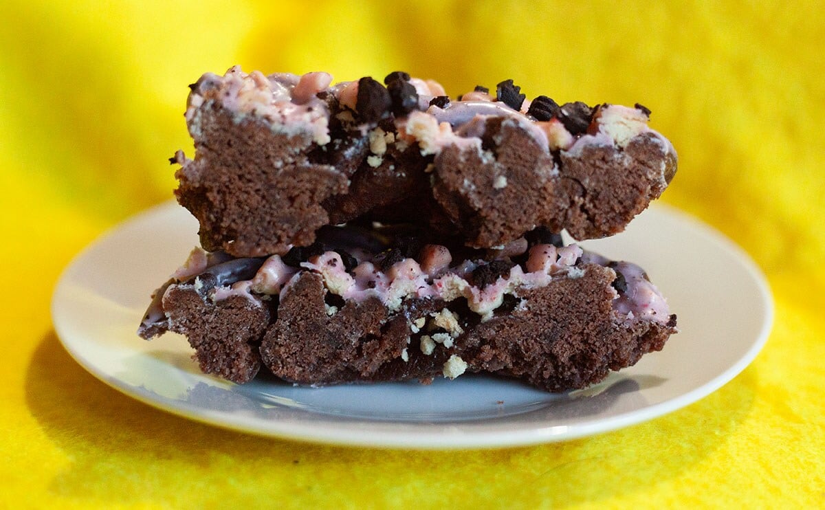 表面はいちごチョコでコーティングされていて、その上にバターとココアの2種類のビスケットがトッピングされています。