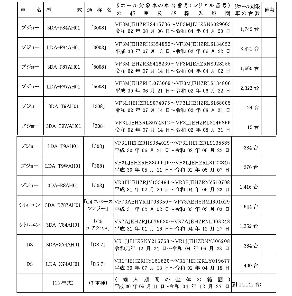 該当車輌は、2018年5月から2022年12月の間に輸入されたプジョー308、3008、508、シトロエンC4スペースツアラー、C5エアクロス、DS7の7車種で、合計1万4141台。