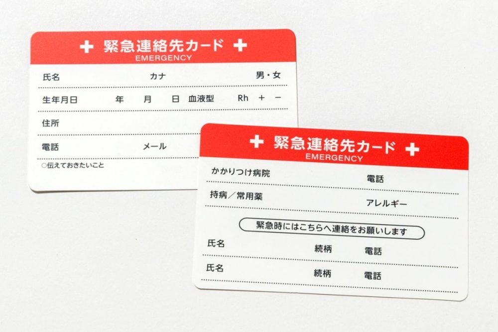 「エマージェンシーカード」とは、氏名や緊急連絡先、血液型や持病といった医療情報を一枚にまとめた緊急連絡カードのことです。