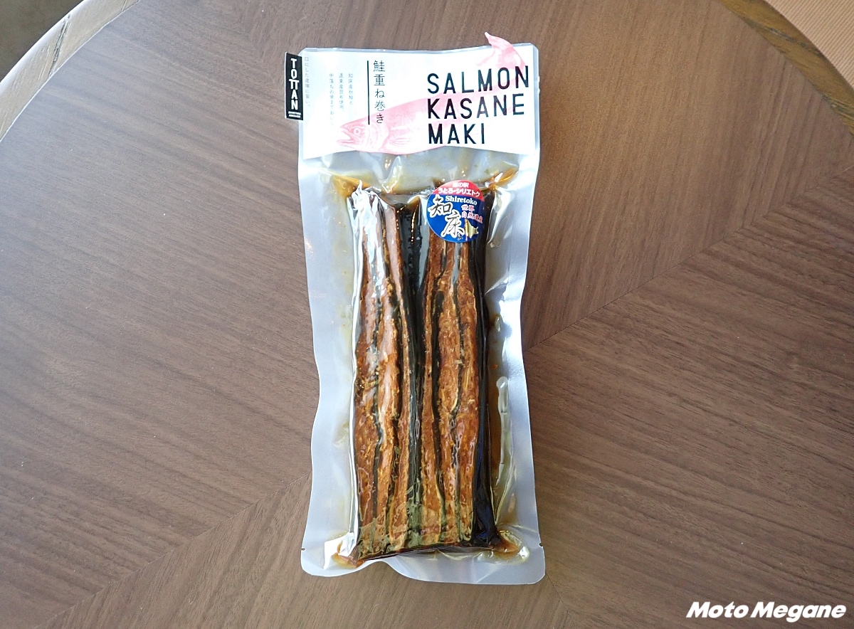 柔らかく煮込んだ知床産鮭の中骨肉と羅臼昆布の重ね巻き。鮭の旨味に昆布の旨味が加わった濃厚な味わいが楽しめる。甘辛い味付けがご飯のお供にも、お酒のツマミにも最適。売店で人気のオリジナル商品。