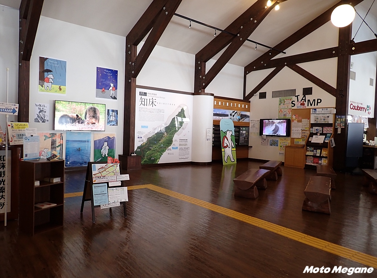 メイン入口を入って正面には、観光案内所と休憩スペースが用意されている。知床の自然パネル展示では、世界自然遺産の登録地域や野生動植物、知床観光の際のマナーなどを学べ、知床の四季を映像でも見ることができる。