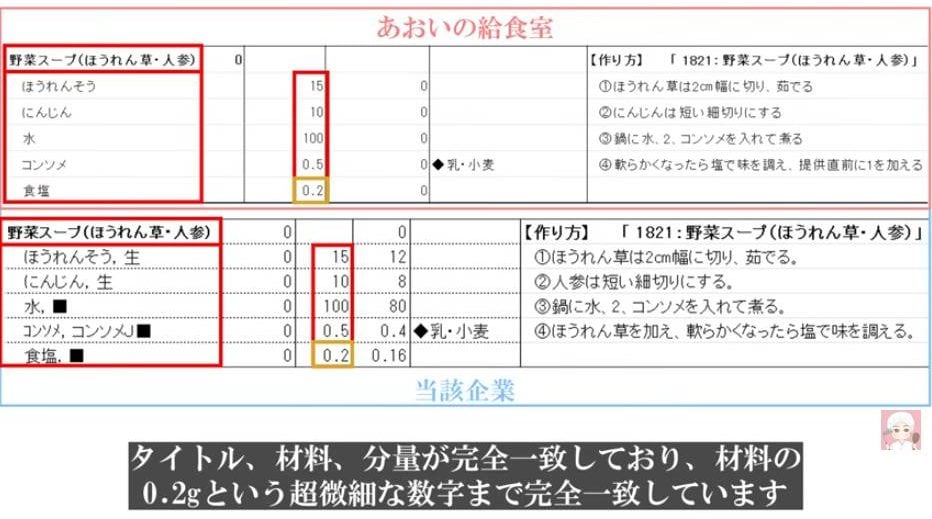 けんたろうによると、レシピ番号とは「レシピを作った人が『ハンバーグは1、カレーライスは2』というようにレシピにつける通し番号」のことで、「違う会社で番号が一致することは、まずあり得ません」と断言。ところが、この給食業者のレシピは「1821番=野菜スープ」となっており、「あおいの給食室レシピと完全に一致」しているのだとか。「あおいの給食室ではレシピ番号を一切公開したことがないため、過去にあおいの給食室レシピを提供された企業しか知り得ない機密情報です」と話しました。
